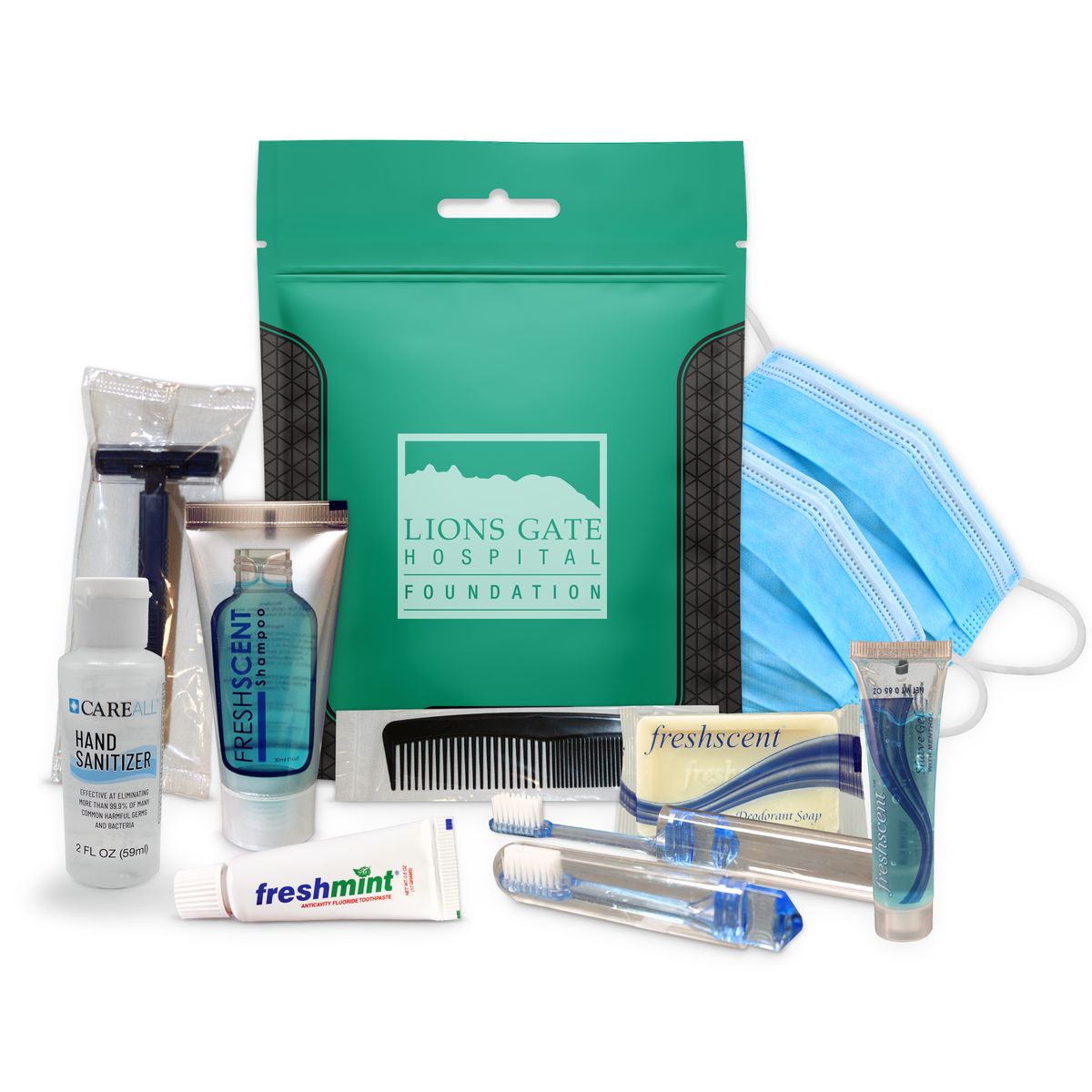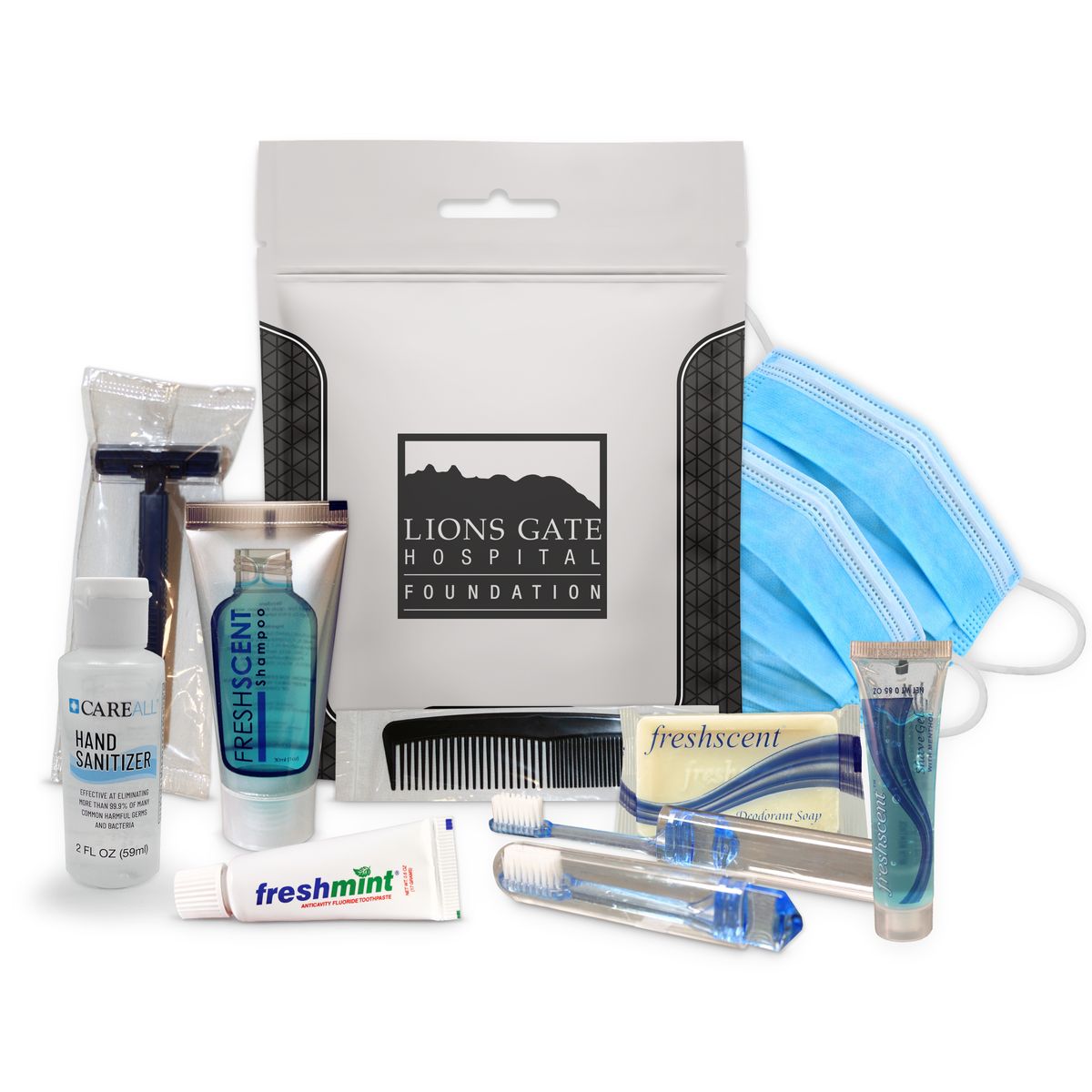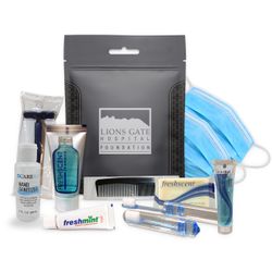 This zip-lock style kit is designed for hygiene and PPE needs and is a great kit for use as a Homeless Hygiene Kit, Survival Overnight Kit, Charity Give away and the like. The USA made waterproof bag can be used over and over for storing other valuables as well. Includes a Razor, Shave Cream, Toothbrush, Toothpaste, Shampoo, Deodorant Soap, comb, masks and sanitizer. Imprint colors in black or white only.